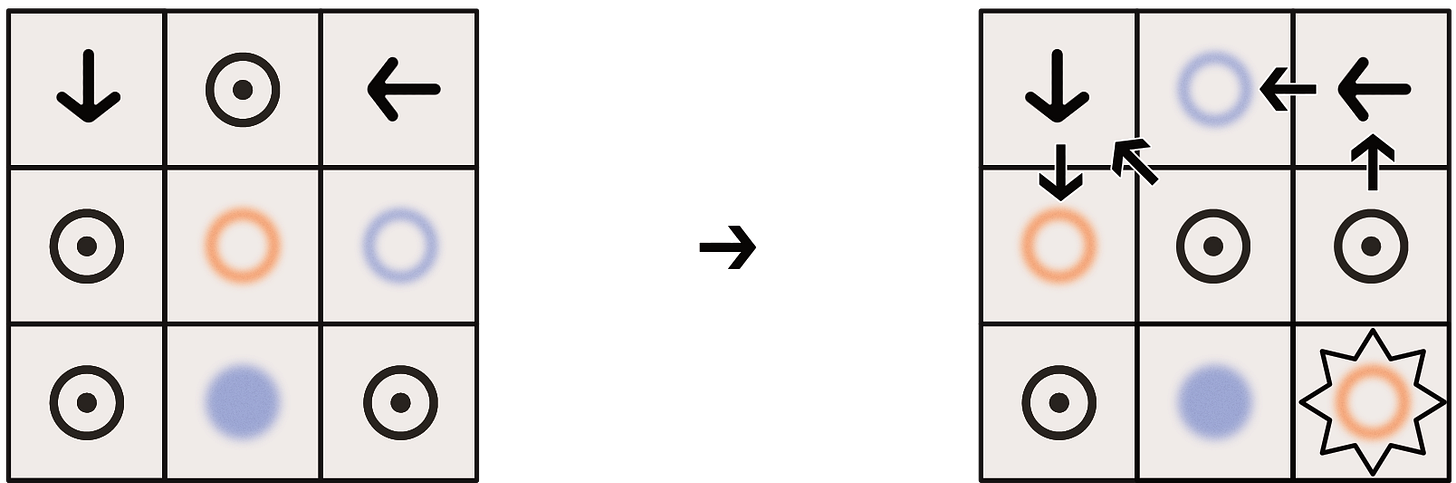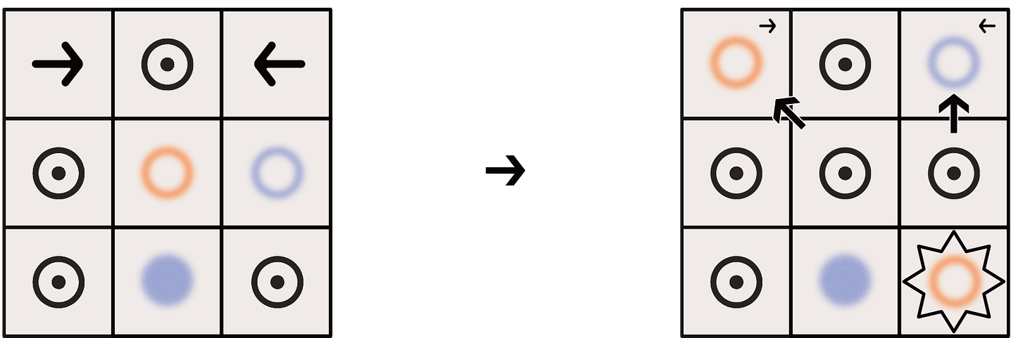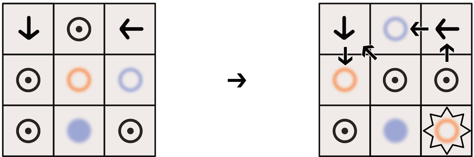 Arrow: If a Ring is pushed onto an Arrow, it is pushed 1 space further in the Arrow direction. Each Arrow triggers once per turn.